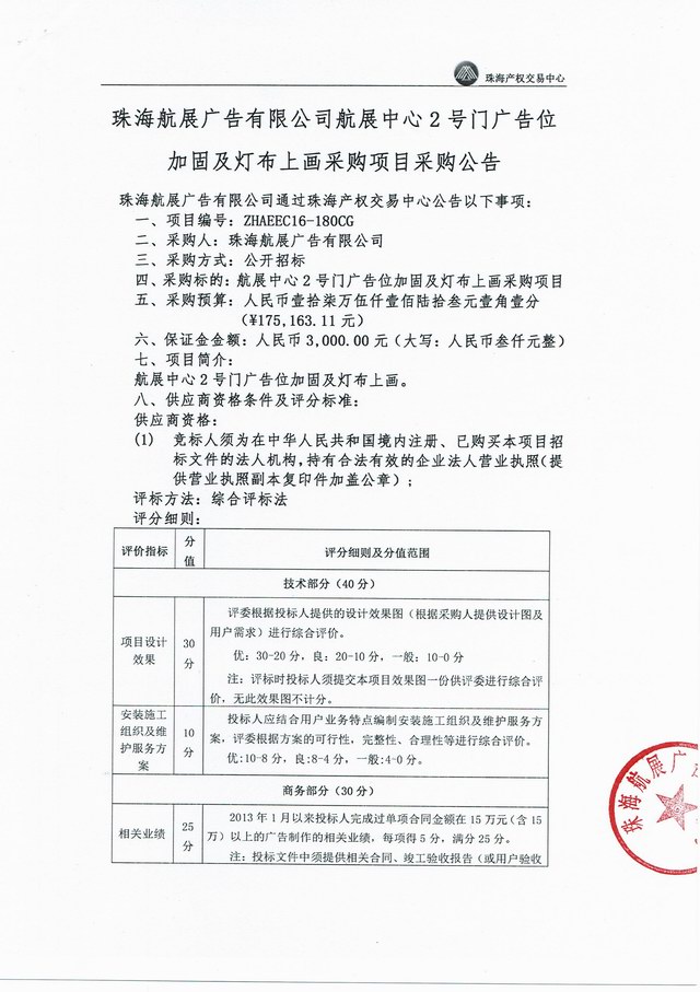 航展中心2号门广告位加固及灯布上画采购项目采购公示