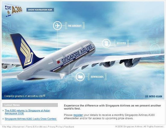 作为首个由A380飞机用户开通的网站,singaporeair.com/a380是一个完全互动、多功能的门户网站。通过该网站你可以了解有关新加坡航空公司A380飞机,以及人们热切期待的有关其首次投入商业运营的最新新闻和信息。