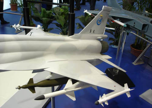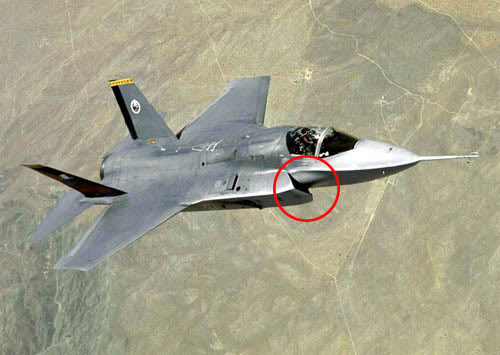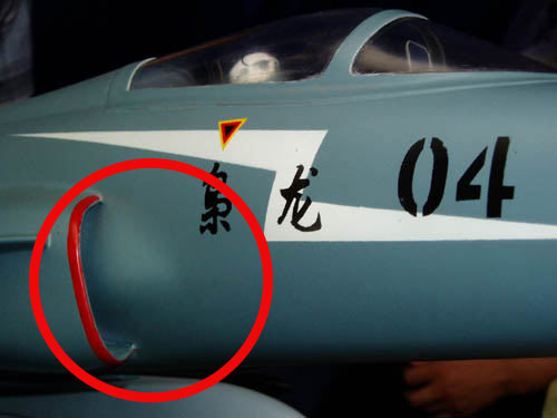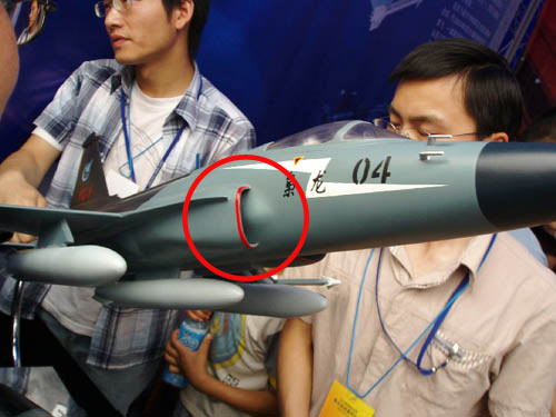 注意图中红圈部位:“枭龙”04机的模型显示,在进气道设计方面,“枭龙”将要放弃传统的附面层隔板和机械调节机构设计(飞机高速飞行时机身表面会产生一层很薄的低能量紊流层,这就是附面层,附面层的气流如果进入进气道,会使发动机发生喘振,严重时甚至发生空中停车事故,因此战斗机都会采取措施避免附面层气流进入进气道,安装附面层隔板是一个常用的办法。而机械调节机构用于在不同速度时控制进气流量的大小,并使气流在进入喷气发动机前变得平顺。),而改用了与美军最新型战斗机F35相同的DSI设计。