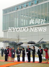 图:有关人士在日本新北九州机场内为机场大楼前的纪念碑举行揭幕仪式。