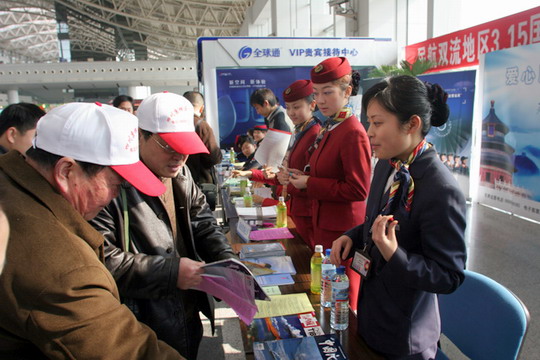 3月15日,西南民航各驻场单位组织了“民航消费者权益日”活动。当天,国航西南分公司运行质量部、地面服务部、客舱部和成都营业部联合在成都双流国际机场候机大厅里拉起横幅,向过往旅客派送宣传材料介绍公司新的服务项目、回答旅客关于维权方面的咨询,并现场受理旅客投诉。