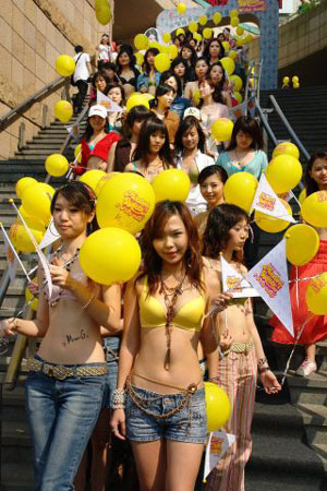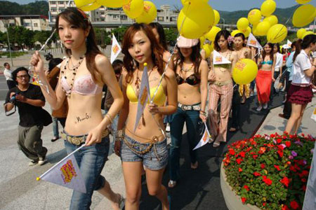 民进党游行遇对手 逾百辣妹内衣秀抢镜头(图)