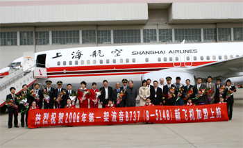 上海航空公司今年引进的第一架波音737-800新飞机,于3月25日中午13时20分,从美国波音公司所在地西雅图飞抵上海,正式加盟上海航空公司机队,使上海航空公司机队增扩为43架飞机。