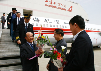 上海航空公司总经理范鸿喜、副总经理丁兴国、邵晓云、顾佳丹、总助王树迅及有关部门领导到机场迎接,副总经理刘效文带领的接机组随机回到上海。