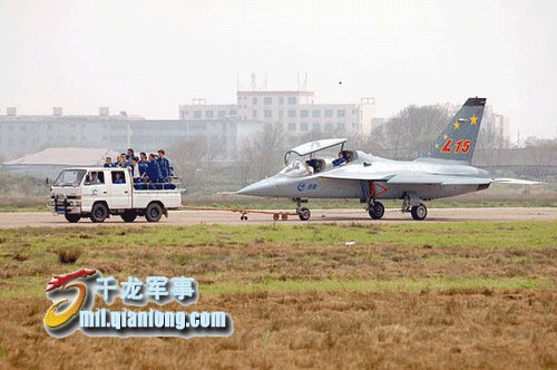 试飞前洪都试飞站地勤人员将L-15拖行到起飞位置并作细致检查。