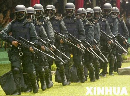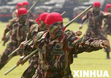 印尼陆军特别部队的士兵在纪念仪式上表演棍操。