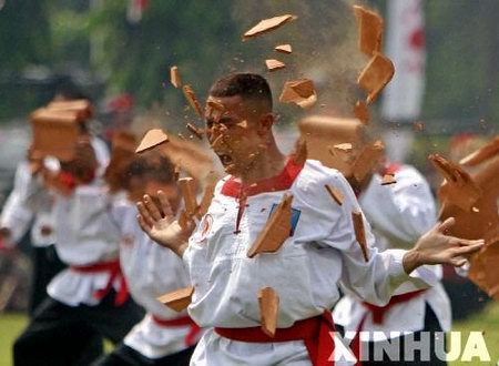 印尼陆军特别部队的士兵在纪念仪式上表演“铁头功”。