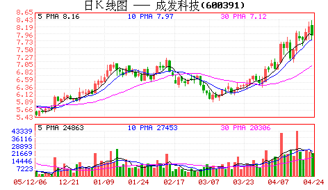 成发科技市盈率略高于国际市场,但市净率偏低。由于成发科技未来三年净利润复合增长率为24.66%,我们认为公司合理的PE 应该为20 倍。另一方面,我们分别给予PE 和PB 估值各50%的权重。我们认为市场对成发科技较为合理的定价7.79 元附近。目前,公司正处于股改阶段,价格含权。即使按照市场平均送股水平,目前的价格吸引力不是特别强。因此,我们维持“持有”的投资建议。