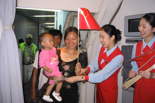 当满脸疲倦和恐惧疲惫的侨胞走进客舱门时,看到客舱挂有国旗,身着鲜艳红制服南航空姐,亲切的笑容、热情的问候刹那间让他们回到了家,见到了亲人,感受到最深的同胞之情。乘务组把提前准备好的国旗送到每位旅客的手中,接过五星红旗,旅客们拿到国旗非常激动,都说,“太好了,你们来接我们太好了。”纷纷要求与乘务人员留影。一位侨胞特地向乘务组多要了一面国旗,他的家以及店铺全部被烧毁,已是无家可归。他含着眼泪说:“我一定要把它带回家,告诉我的家人还是回到祖国好,我为拥有一面中国的国旗而骄傲。”
