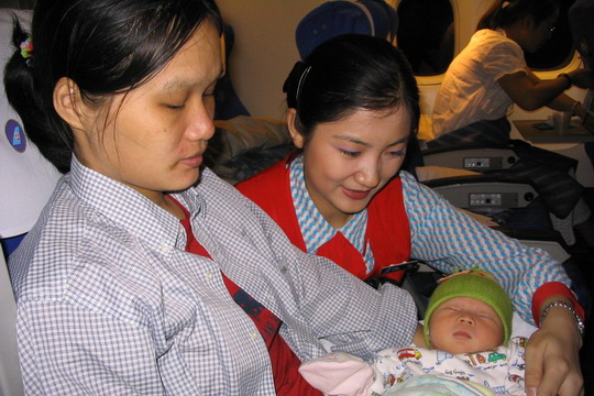 图3:南航乘务员正在悉心照顾特殊的旅客,一位是刚刚生完孩子的母亲,一位是才出生14天的婴儿。(摄影:笪慧敏)