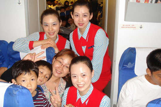 图4:远离了骚乱的侨胞在客舱里露出了灿烂的微笑,与南航乘务员开心合影。(摄影:李妍)