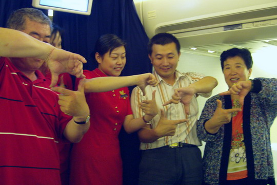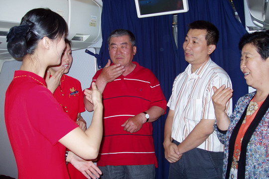 图4:乘务员教旅客做手语——此图全部动作是手语“南方航空”的意思