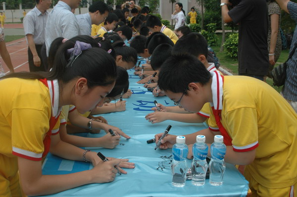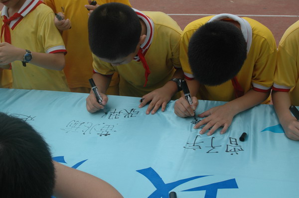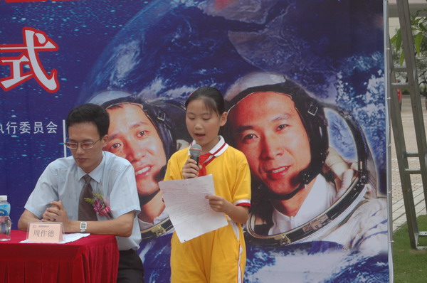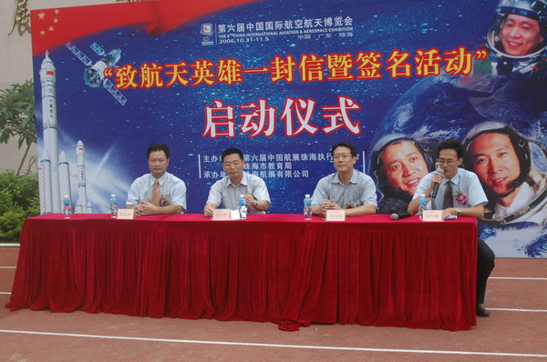 6月7日下午,在香洲一小的操场上,身着统一校服的学生整齐地排列着,由第六届中国航展珠海执委会与市教育局联合主办的“致航天英雄一封信暨签名”活动的启动仪式在这里举行。珠海市政府副秘书长、第六届中国航展珠海执委会副秘书长兼办公室主任刘华强,珠海市教育局副局长邬向明,第六届中国航展珠海执委会副秘书长、珠海航展有限公司总经理周乐伟出席了本次活动的启动仪式。